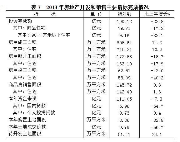在房地产开发投资中,商品住宅投资79.71亿元,下降17.3%;办公楼投资1.46亿元,下降51.9%;商业营业用房投资为10.46亿元,下降16.1%;其他用房投资8.49亿元,下降52.4%。