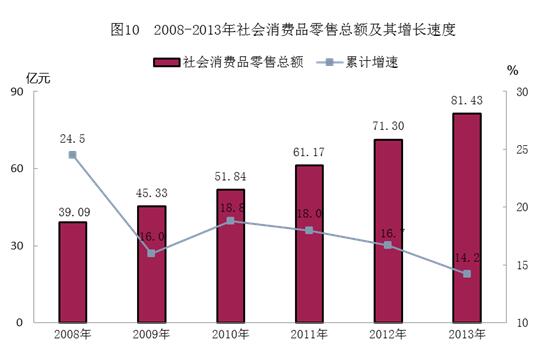 全年实现社会消费品零售总额81.43亿元,增长14.2%,扣除价格因素,实际增长12.6%。按经营地统计,城镇消费品零售额73.09亿元,增长14.4%;乡村消费品零售额8.34亿元,增长11.6%。