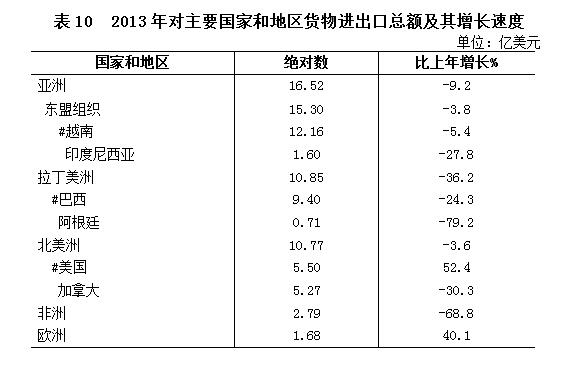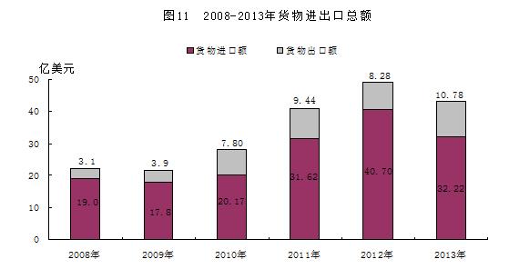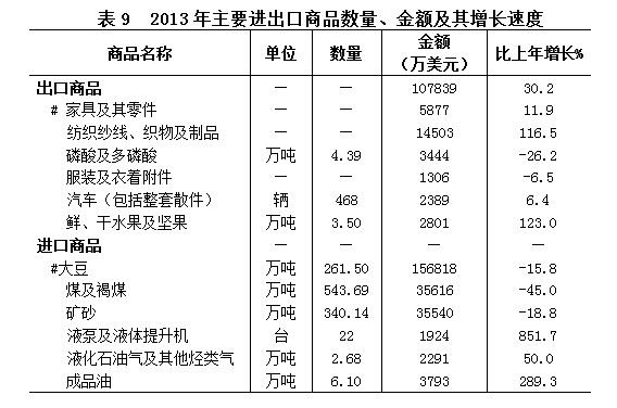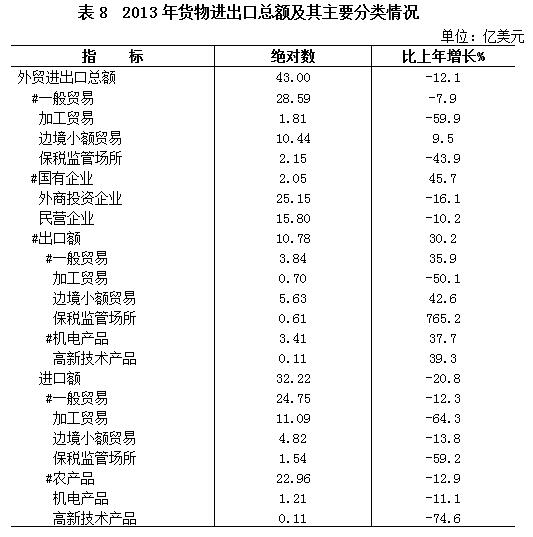 据海关统计,全年货物进出口总额43.00亿美元,下降12.2%,其中,进口总额32.22亿美元,下降20.8%;出口总额10.78亿美元,增长30.2%。外贸进出口规模在全区排第3位,进口依旧保持优势地位,占全区进口总量的22.8%,稳居全区首位。全年边贸成交额241.50亿元,增长19.6%,其中,进口140.38亿元,增长14.8%;出口101.12亿元,增长26.9%。