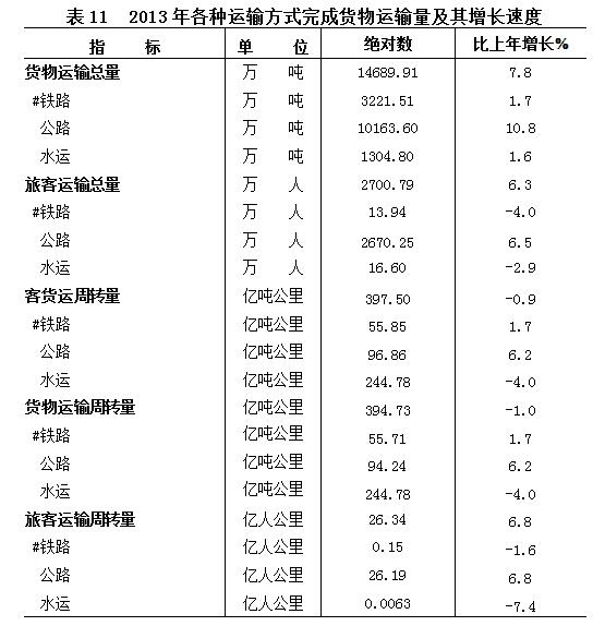 全年交通运输、仓储及邮政业实现增加值41.75亿元,下降1.8%。全年货物运输总量1.47亿吨,增长7.8%,旅客运输总量2700万人,增长6.3%;客货运周转量397.50亿吨公里,下降0.9%。