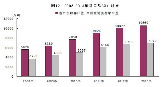全年港口货物吞吐量10560万吨,增长5.0%,其中集装箱吞吐量完成30.98万标准箱,增长14.6%。从全年各季度来看,一季度完成2408万吨,增长7.8%;二季度完成2512万吨,下降1.5%;三季度完成2637万吨,增长7.7%;四季度完成3003万吨,增长6.3%。从货物贸易方式看,外贸货物吞吐量7980万吨,增长9.7%;内贸货物吞吐量2581万吨,下降7.3%。从吞吐方式看,进口7592万吨,增长9.5%;出口2969万吨,下降4.9%。从港口规模来看,防城港完成货物吞吐量6970万吨,占全市吞吐量66.0%,实现增长3.1%;中小港完成吞吐量3590万吨,占全市吞吐量34%,实现增长8.9%。从商品主要种类看,完成吞吐量前五位货种分别为煤炭及制品4650万吨,金属矿石2334万吨,粮食604万吨,化工原料及制品423万吨,农林牧渔产品404万吨,化肥及农药323万吨,其中煤炭和金属矿石两大货种的吞吐量占全市吞吐量66.1%,与上年基本持平。