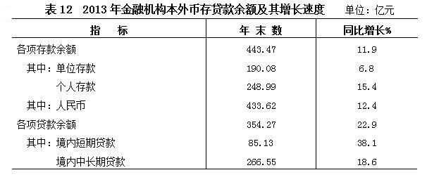 年末,金融机构本外币各项存款余额443.47亿元,同比增长11.9%。其中,人民币各项存款余额433.62亿元,同比增长12.4%。金融机构本外币各项贷款余额354.27亿元,同比增长22.9%。其中,人民币各项贷款余额335.40亿元,同比增长21.9%。全年新增金融机构本外币贷款65.95亿元,同比增长17.5%。
