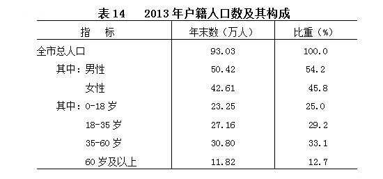 年末常住人口89.90万人,比上年末增加1.21万人,其中城镇人口47.66万人。全年人口出生率15.01‰,人口死亡率5.99‰,人口自然增长率9.02‰。据公安部门统计,年末全市户籍人口93.03万人,比上年末增加1.47万人。