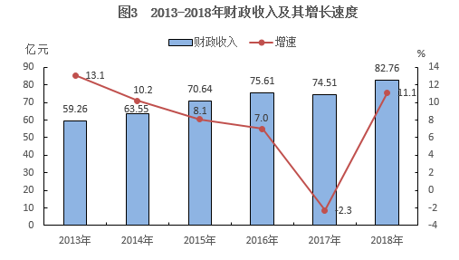 全年财政收入82.76亿元,增长11.1%。其中,税收收入71.43亿元,增长20.8%;非税收收入11.33亿元,下降26.2%。公共财政预算收入43.98亿元,下降7.6%。公共财政预算支出127.34亿元,增长5.7%。其中,公共安全支出增长6.5%,教育支出下降4.5%,文化体育与传媒支出增长9.6%,城乡社区事务支出增长3.0%。