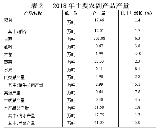 全年农作物总播种面积119.13千公顷,比上年增加0.08千公顷。其中,粮食种植面积44.46千公顷,减少1.06千公顷;油料种植面积3.24千公顷,增加0.14千公顷;甘蔗种植面积41.63千公顷,增加0.59千公顷;蔬菜种植面积25.45千公顷,增加0.32千公顷。年末果园面积10.92千公顷,增加0.96千公顷。全年粮食总产量17.46万吨,增长1.4%;甘蔗产量301.08万吨,增加17.76万吨,增长6.3%;油料产量0.67万吨,增长3.8%;水果产量9.11万吨,增长8.1%;蔬菜产量33.33万吨,增长2.3%。