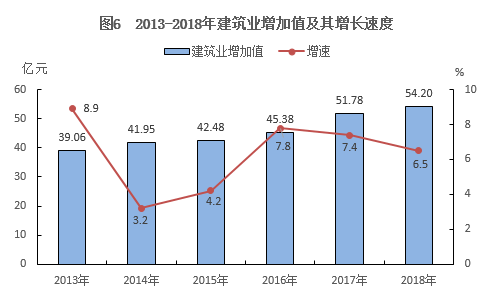 全年建筑业增加值增长6.5%。具有资质等级的总承包和专业承包建筑业企业80家,全年完成建筑业总产值148.14亿元,增长3.3%;房屋建筑施工面积503.18万平方米,增长14.2%;房屋建筑竣工面积337.78万平方米,增长13.8%。