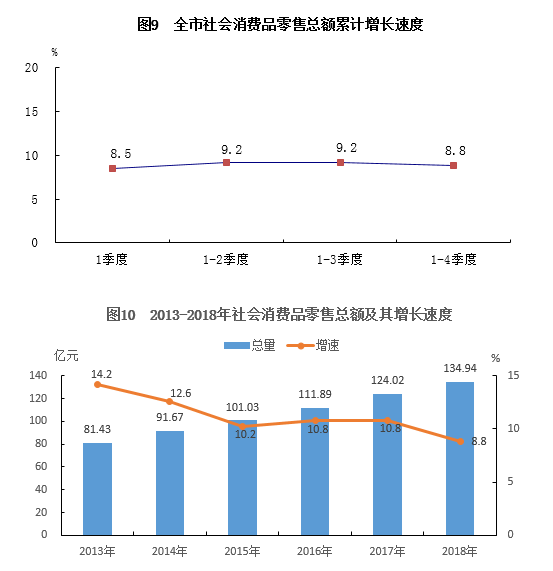 全年实现社会消费品零售总额134.94亿元,增长8.8%,扣除价格因素,实际增长5.2%。按经营地统计,城镇消费品零售额121.22亿元,增长8.7%;乡村消费品零售额13.72亿元,增长10.1%。