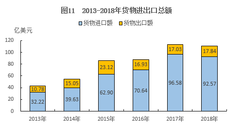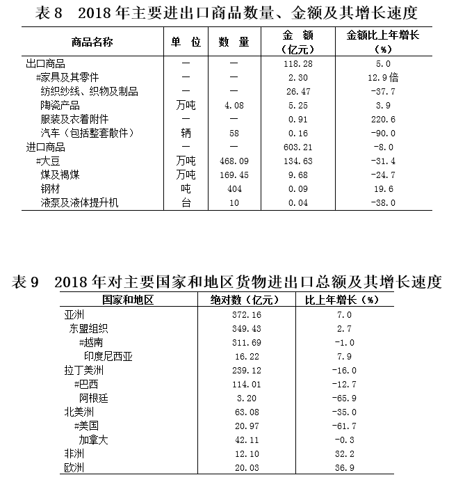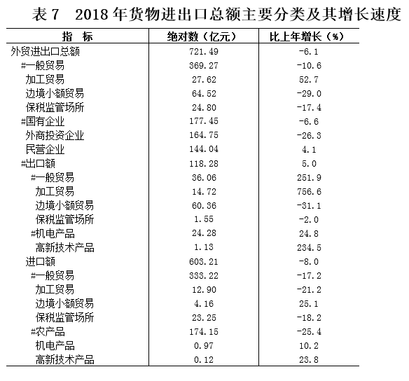 据海关统计,全年货物进出口总额721.49亿元,下降6.1%,其中,出口总额118.28亿元,增长5.0%;进口总额603.21亿元,下降8.0%。外贸进出口规模居全区第3位,其中进口占全区进口总量的31.2%,居全区第1位。全年边境小额贸易(边民互市贸易除外)64.52亿元,下降29.0%,其中,出口60.36亿元,下降31.1%;进口4.16亿元,增长25.1%。