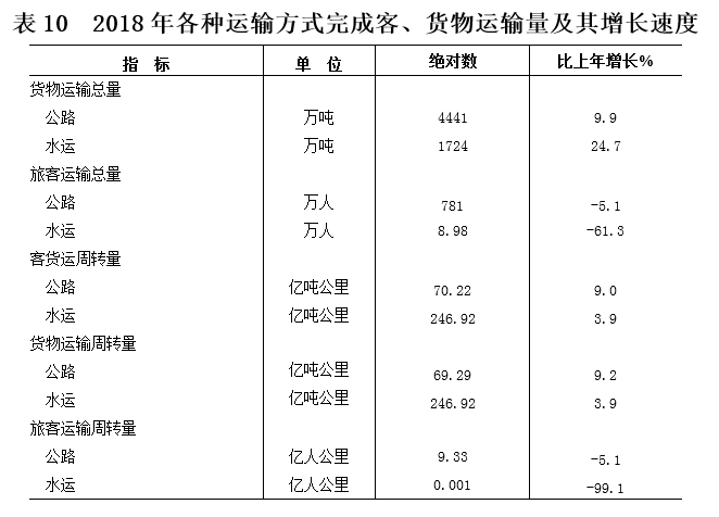 全年交通运输、仓储及邮政业实现增加值增长4.8%。全年公路和水路客货运周转量317.14亿吨公里,增长5.0%。公路和水路货物运输总量6165万吨,增长13.7%;旅客运输总量789.98万人,下降6.6%。