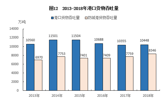 全年港口货物吞吐量10448万吨,增长0.9%。集装箱吞吐量完成31.20万标准箱,增长16.0%。从全年各季度来看,一季度完成2524万吨,增长9.4%;二季度完成2894万吨,增长15.6%;三季度完成2619万吨,增长2.8%;四季度完成2412万吨,下降19.5%。从货物贸易方式看,外贸货物吞吐量7453万吨,增长0.01%;内贸货物吞吐量2996万吨,增长3.2%。从吞吐方式看,出口2399万吨,下降1.0%;进口8050万吨,增长1.5%。从港口规模来看,防城港完成货物吞吐量8346万吨,增长7.6%,总量占全市吞吐量的79.9%;中小港完成吞吐量2102万吨,下降19.0%,总量占全市吞吐量20.1%。从商品主要种类看,完成吞吐量前五位货种分别为:金属矿石3824万吨、煤炭及制品2703万吨、农林牧渔产品744万吨、粮食649万吨、化肥及农药477万吨。