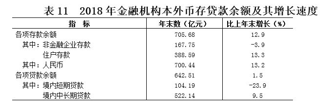 年末,金融机构本外币各项存款余额705.68亿元,同比增长12.9%,其中人民币各项存款余额700.44亿元,同比增长13.2%;金融机构本外币各项贷款余额642.51亿元,同比增长1.5%,其中人民币各项贷款余额639.92亿元,同比增长1.6%。全年新增金融机构本外币贷款9.58亿元,同比下降91.7%。