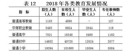 全年普通高等教育招生1153人,在校生4880人。各类中等职业教育招生3483人,在校生8924人,毕业生2544人。普通高中招生7021人,在校生18348人,毕业生5460人。普通初中招生14652人,在校生40725人,毕业生12524人。普通小学招生19294人,在校生101660人,毕业生15594人。幼儿园在园儿童45397人。