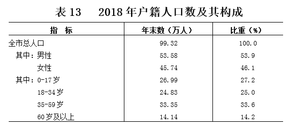 年末常住人口95.33万人,比上年末增加1.31万人,其中城镇人口55.67万人。全年人口出生率14.23‰,人口死亡率4.63‰,人口自然增长率9.60‰。据公安部门统计,年末全市户籍人口99.32万人,比上年末增加1.53万人。