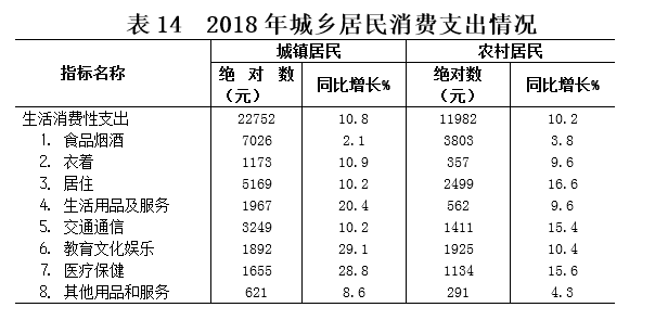 全年城镇居民人均可支配收入34325元,增长7.0%,扣除价格因素,实际增长3.5%;农村居民人均可支配收入14617元,增长9.3%,扣除价格因素,实际增长5.7%。城镇居民人均生活消费支出22752元,增长10.8%,扣除价格因素,实际增长7.2%;农村居民人均生活消费支出11982元,增长10.2%,扣除价格因素,实际增长6.6%。城镇居民食品烟酒消费支出占消费总支出的比重为30.9%,农村居民家庭食品烟酒消费支出占消费总支出的比重为31.7%。