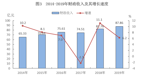 全年财政收入87.86亿元,增长6.2%。其中,税收收入73.04亿元,增长2.3%;非税收收入14.82亿元,增长30.8%。公共财政预算收入47.41亿元,增长7.8%。公共财政预算支出139.53亿元,增长9.6%。其中,公共安全支出增长10.5%,教育支出增长25.2%,社会保障和就业支出增长7.7%,文化旅游体育与传媒支出增长2.6%,节能环保支出增长1.3倍。
