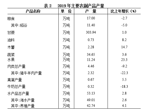 全年农作物总播种面积116.94千公顷,比上年减少2.20千公顷。其中,粮食种植面积43.88千公顷,减少0.6千公顷;油料种植面积3.31千公顷,增加0.07千公顷;甘蔗种植面积39.75千公顷,减少1.88千公顷;蔬菜种植面积25.90千公顷,增加0.45千公顷。年末果园面积12.03千公顷,增加1.12千公顷。全年粮食总产量17.00万吨,下降2.7%;甘蔗产量303.94万吨,增加2.85万吨,增长1.0%;油料产量0.73万吨,增长8.2%;水果产量11.24万吨,增长23.3%;蔬菜产量34.65万吨,增长3.6%。