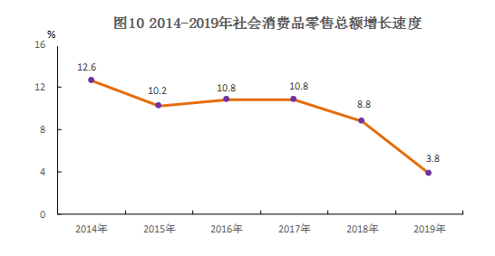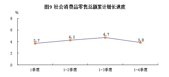 全年实现社会消费品零售总额增长3.8%,扣除价格因素,实际增长0.2%。按经营地统计,城镇消费品零售额增长3.5%;乡村消费品零售额增长7.0%。
