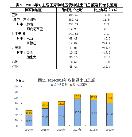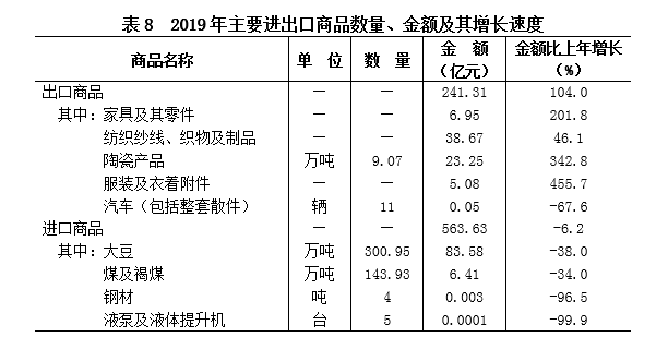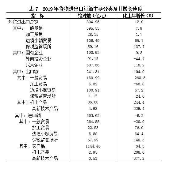 据海关统计,全年货物进出口总额804.95亿元,增长12.0%,其中,出口总额241.31亿元,增长104.0%;进口总额563.63亿元,下降6.2%。外贸进出口规模居全区第2位,其中进口占全区进口总量的26.9%,居全区第2位。全年边境小额贸易(边民互市贸易除外)106.49亿元,增长65.1%,其中,出口100.91亿元,增长67.2%;进口5.58亿元,增长34.4%。