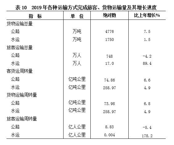 全年交通运输、仓储及邮政业实现增加值增长4.9%。全年公路和水路客货运周转量333.83亿吨公里,增长5.3%。公路和水路货物运输总量6526万吨,增长5.9%;旅客运输总量765万人,下降3.2%。