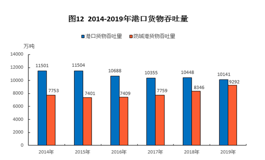 全年港口货物吞吐量10141万吨,增长13.4%。集装箱吞吐量完成42.10万标准箱,增长34.9%。从全年各季度来看,一季度完成2325万吨,增长8.4%;二季度完成2556万吨,增长11.0%;三季度完成2565万吨,增长11.1%;四季度完成2694万吨,增长23.4%。从货物贸易方式看,外贸货物吞吐量7687万吨,增长9.6%;内贸货物吞吐量2453万吨,增长27.3%。从吞吐方式看,出口1467万吨,增长1.6%;进口8673万吨,增长15.7%。从港口规模来看,渔澫港完成货物吞吐量9292万吨,增长11.2%,总量占全市吞吐量的91.6%;企沙港完成吞吐量849万吨,增长45.1%,总量占全市吞吐量8.4%。从商品主要种类看,完成吞吐量前五位货种分别为:金属矿石4395万吨、煤炭及制品2862万吨、粮食589万吨、化肥及农药541万吨、钢铁512万吨。