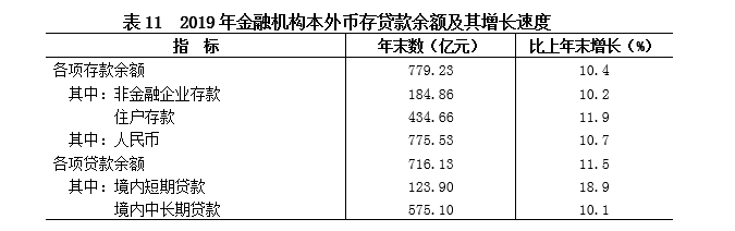 年末,金融机构本外币各项存款余额779.23亿元,同比增长10.4%,其中人民币各项存款余额775.53亿元,同比增长10.7%;金融机构本外币各项贷款余额716.13亿元,同比增长11.5%,其中人民币各项贷款余额705.31亿元,同比增长10.2%。全年新增金融机构本外币贷款71.68亿元,同比增长648.5%。