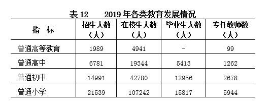 全年普通高等教育招生1989人,在校生4941人。普通高中招生6781人,在校生19344人,毕业生5413人。普通初中招生14991人,在校生42780人,毕业生12956人。普通小学招生21539人,在校生107242人,毕业生15817人。幼儿园在园儿童47402人。