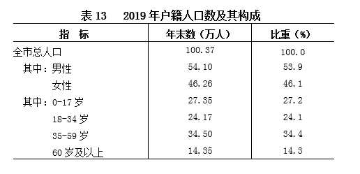 年末常住人口96.36万人,比上年末增加1.03万人,其中城镇人口57.52万人。全年人口出生率13.24‰,人口死亡率4.53‰,人口自然增长率8.71‰。据公安部门统计,年末全市户籍人口100.37万人,比上年末增加1.05万人。