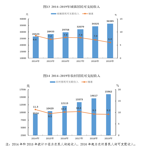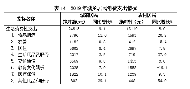 全年城镇居民人均可支配收入36385元,增长6.0%,扣除价格因素,实际增长2.3%;农村居民人均可支配收入15962元,增长9.2%,扣除价格因素,实际增长5.4%。城镇居民人均生活消费支出24815元,增长9.1%,扣除价格因素,实际增长5.3%;农村居民人均生活消费支出13119元,增长8.0%,扣除价格因素,实际增长4.2%。城镇居民食品烟酒消费支出占消费总支出的比重为31.4%,农村居民家庭食品烟酒消费支出占消费总支出的比重为35.0%。