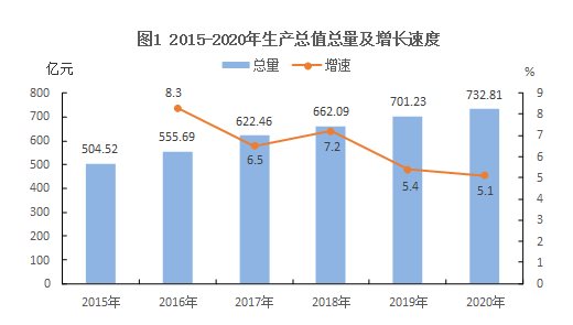 初步核算,全年实现生产总值[1]732.81亿元,比上年增长5.1%。从产业看,第一产业增加值111.08亿元,增长3.9%;第二产业增加值348.07亿元,增长6.8%;第三产业增加值273.66亿元,增长3.2%。三次产业对经济增长的贡献率分别为11.4%、64.9%、23.6%,其中,工业对经济增长的贡献率为50.5%。