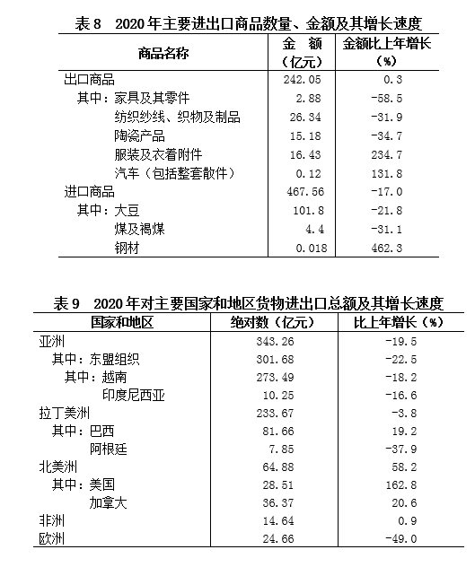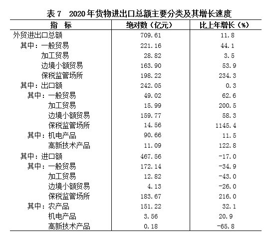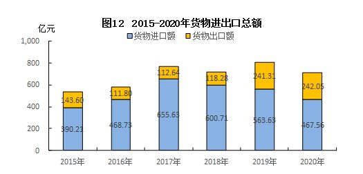 据海关统计,全年货物进出口总额709.61亿元,下降11.8%,其中,出口总额242.05亿元,增长0.3%;进口总额467.56亿元,下降17.0%。外贸进出口规模居全区第3位,其中进口占全区进口总量的21.7%,居全区第3位。全年边境小额贸易(边民互市贸易除外)163.90亿元,增长53.9%,其中,出口159.77亿元,增长58.3%;进口4.13亿元,下降26.0%。