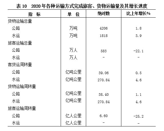 全年公路和水路客货运周转量309.90亿吨公里,比上年增长4.1%。公路和水路货物运输总量6024万吨,增长2.4%;旅客运输总量583万人,下降22.1%。