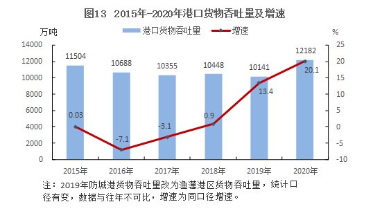 全年港口货物吞吐量12182万吨,增长20.1%。集装箱吞吐量完成60.11万标准箱,增长42.8%。从全年各季度来看,一季度完成2736万吨,增长17.7%;二季度完成3036万吨,增长18.8%;三季度完成3404万吨,增长32.7%;四季度完成3006万吨,增长11.6%。从货物贸易方式看,外贸货物吞吐量8089万吨,增长5.2%;内贸货物吞吐量4073万吨,增长66.0%。从吞吐方式看,出口2278万吨,增长55.2%;进口9904万吨,增长14.2%。从港区来看,渔澫港完成货物吞吐量10764万吨,增长15.8%,总量占全市吞吐量的88.4%;企沙港完成吞吐量1418万吨,增长67.0%,总量占全市吞吐量11.6%。从商品主要种类看,完成吞吐量前五位货种分别为:金属矿石5681万吨、煤炭及制品2664万吨、钢铁1027万吨、粮食582万吨、化肥及农药499万吨。