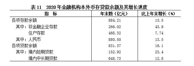 年末各类金融机构(含银行、证券、保险、融资担保、小额贷款、营业网点)263家。年末,金融机构本外币各项存款余额884.21亿元,同比增长13.5%,其中人民币各项存款余额880.50亿元,同比增长13.5%;金融机构本外币各项贷款余额831.37亿元,同比增长16.1%,其中人民币各项贷款余额819.13亿元,同比增长16.1%。全年新增金融机构本外币贷款115.24亿元,同比增长60.8%。