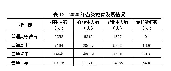全年普通高等教育招生2252人,在校生5313人。普通高中招生7164人,在校生20667人,毕业生5752人。普通初中招生14342人,在校生43852人,毕业生13201人。普通小学招生19176人,在校生111411人,毕业生14885人。幼儿园在园儿童48291人。