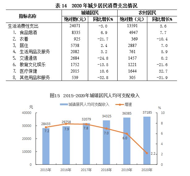 全年城镇居民人均可支配收入37185元,增长2.2%,扣除价格因素,实际下降0.4%;农村居民人均可支配收入[5]17223元,增长7.9%,扣除价格因素,实际增长5.2%。城镇居民人均生活消费支出24071元,下降3.0%,扣除价格因素,实际下降5.5%;农村居民人均生活消费支出13591元,增长3.6%,扣除价格因素,实际增长1.0%。城镇居民食品烟酒消费支出占消费总支出的比重为34.6%,农村居民家庭食品烟酒消费支出占消费总支出的比重为36.4%。