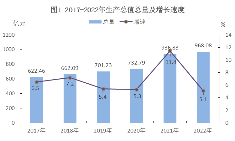 初步核算,全年全市实现生产总值[1]968.08亿元,按可比价计算,比上年增长5.1%。从产业看,第一产业增加值125.14亿元,增长4.2%;第二产业增加值517.84亿元,增长5.5%;第三产业增加值325.09亿元,增长4.8%。第一产业增加值占地区生产总值比重为12.9%,第二产业增加值比重为53.5%,第三产业增加值比重为33.6%。按常住人口计算,全年人均地区生产总值91505元,比上年增长4.5%。