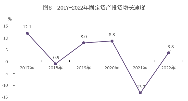 全年固定资产投资(不含农户)比上年增长3.8%。在固定资产投资中,第一产业投资下降39.9%;第二产业投资增长11.6%;第三产业投资下降3.1%。房地产开发投资下降60.6%,其中商品住宅投资下降63.2%。民间固定资产投资下降9.6%。基础设施投资增长38.3%。