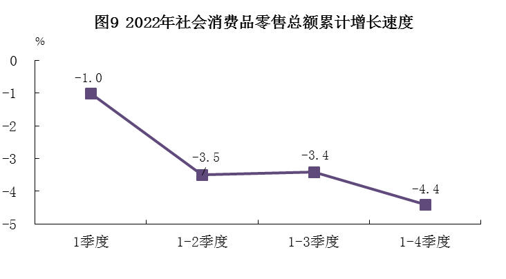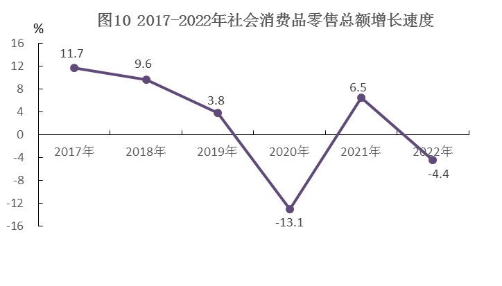 全年实现社会消费品零售总额比上年下降4.4%。按经营地统计,城镇消费品零售额下降4.3%;乡村消费品零售额下降6.6%。