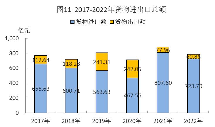 据海关统计,全年货物进出口总额784.57亿元,比上年下降11.7%,其中,出口总额60.86亿元,下降21.9%;进口总额723.70亿元,下降10.7%。外贸进出口规模排全区第三位,其中进口占全区进口总量的25.0%,排全区第二位。全年边境小额贸易(边民互市贸易除外)32.21亿元,下降26.4%,其中,出口29.16亿元,下降23.0%;进口3.06亿元,下降48.6%。