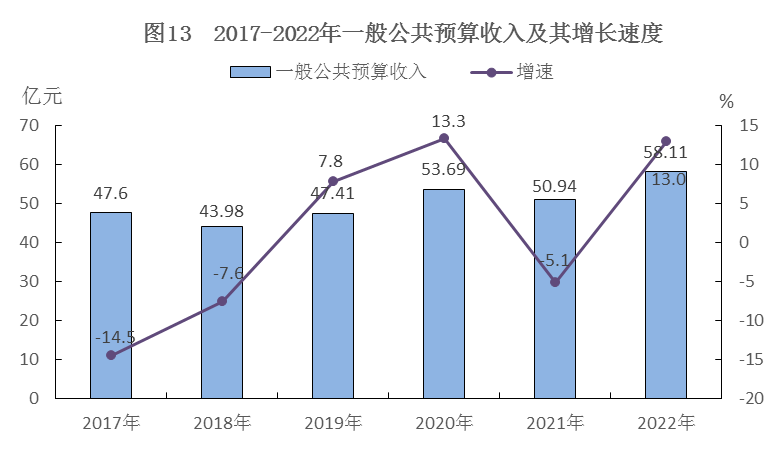 全年一般公共预算收入44.06亿元,比上年下降13.5%,剔除增值税留抵退税因素后同口径完成58.11亿元,增长13.0%。其中,税收收入26.42亿元,下降26.1%,同口径完成40.46亿元,增长11.6%;非税收入17.64亿元,增长16.3%。一般公共预算支出150.37亿元,增长5.1%。其中民生重点领域支出116.52亿元,增长5.7%。重点支出情况如下:社会保障和就业支出20.49亿元,增长7.6%;卫生健康支出19.09亿元,增长33.9%;节能环保支出5.3亿元,增长28.7%;资源勘探工业信息等支出2.93亿元,增长172.2%。