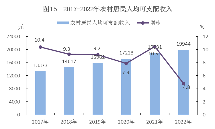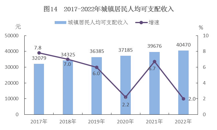 全年城镇居民人均可支配收入40470元,比上年增长2.0%,扣除价格因素,实际增长0.6%;农村居民人均可支配收入19944元,增长4.8%,扣除价格因素,实际增长3.4%。城镇居民人均生活消费支出25824元,增长1.4%,扣除价格因素,实际增长为零;农村居民人均生活消费支出14132元,下降1.9%,扣除价格因素,实际下降3.3%。城镇居民食品烟酒消费支出占消费总支出的比重为32.9%,农村居民家庭食品烟酒消费支出占消费总支出的比重为33.9%。