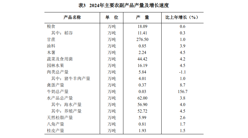 全年农作物总播种面积118.86千公顷。其中,粮食种植面积46.21千公顷,增加0.18千公顷;油料种植面积3.61千公顷,增加0.07千公顷;甘蔗种植面积34.66千公顷,增加0.12千公顷;蔬菜及食用菌种植面积29.03千公顷,增加0.78千公顷。