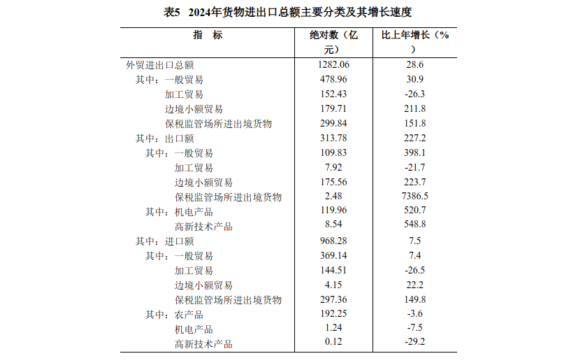 据海关统计,全年货物进出口总额1282.06亿元,比上年增长28.6%。其中,出口额313.78亿元,增长227.2%;进口额968.28亿元,增长7.5%。全年边境小额贸易(边民互市贸易除外)179.71亿元,增长211.8%。其中,出口175.56亿元,增长223.7%;进口4.15亿元,增长22.2%。