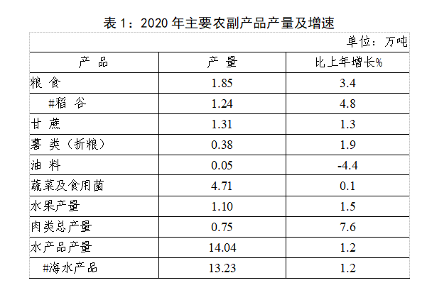 全年粮食总产量1.85万吨,增长3.4%;甘蔗产量1.31万吨,增长1.3%;薯类(折粮)产量0.38万吨,增长1.9%。蔬菜及食用菌产量4.71万吨,增长0.1%;水果产量1.10万吨,增长1.5%;肉类总产量0.75万吨,增长7.6%;水产品产量14.04万吨,增长1.2%。