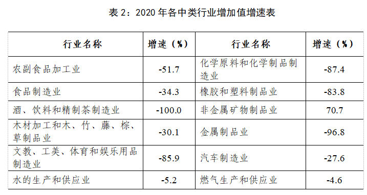 从行业类型看,农副食品加工业增加值下降51.7%;食品制造业增加值下降34.3%;金属制品业下降96.8%;非金属矿物制品业增加值增长70.7%。