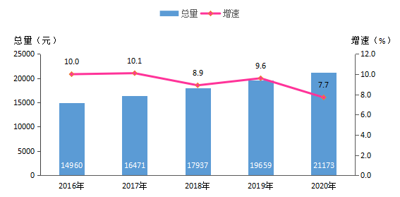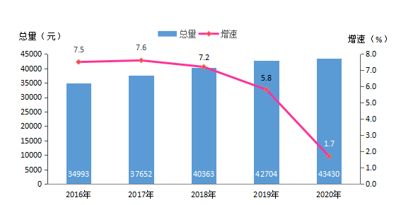 图5:2016年—2020年城镇居民人均可支配收入及增速