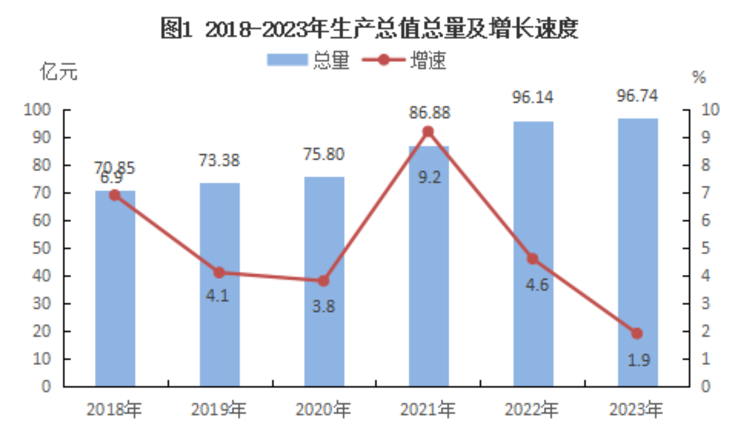 初步核算,全年全县实现生产总值96.74亿元,按可比价计算,比上年增长1.9%。从产业看,第一产业增加值34.91亿元,增长4.6%;第二产业增加值27.67亿元,下降0.9%;第三产业增加值34.16亿元,增长1.2%。第一产业增加值占地区生产总值比重为36.1%,第二产业增加值比重为28.6%,第三产业增加值比重为35.3%。按常住人口计算,全年人均地区生产总值49319元,比上年增长2.0%[2]。