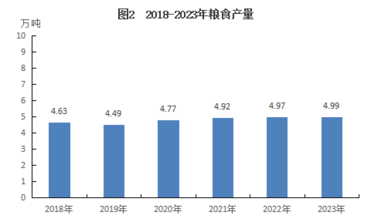 全年全县粮食总产量4.99万吨,比上年增加了179.02吨,比上年增长0.4%;其中,春粮产量0.28万吨,下降3.4%;夏粮产量3.10万吨,下降0.1%;秋粮产量1.62万吨,增长1.9%。其中,稻谷产量3.37万吨,增长0.6%;玉米产量1.36万吨,下降0.4%;油料产量0.26万吨,增长2.8%;甘蔗产量248.50万吨,下降9.5%;蔬菜及食用菌产量7.79万吨,增长4.4%;园林水果产量6.41万吨,比上年增加了0.32万吨,增长5.3%。
