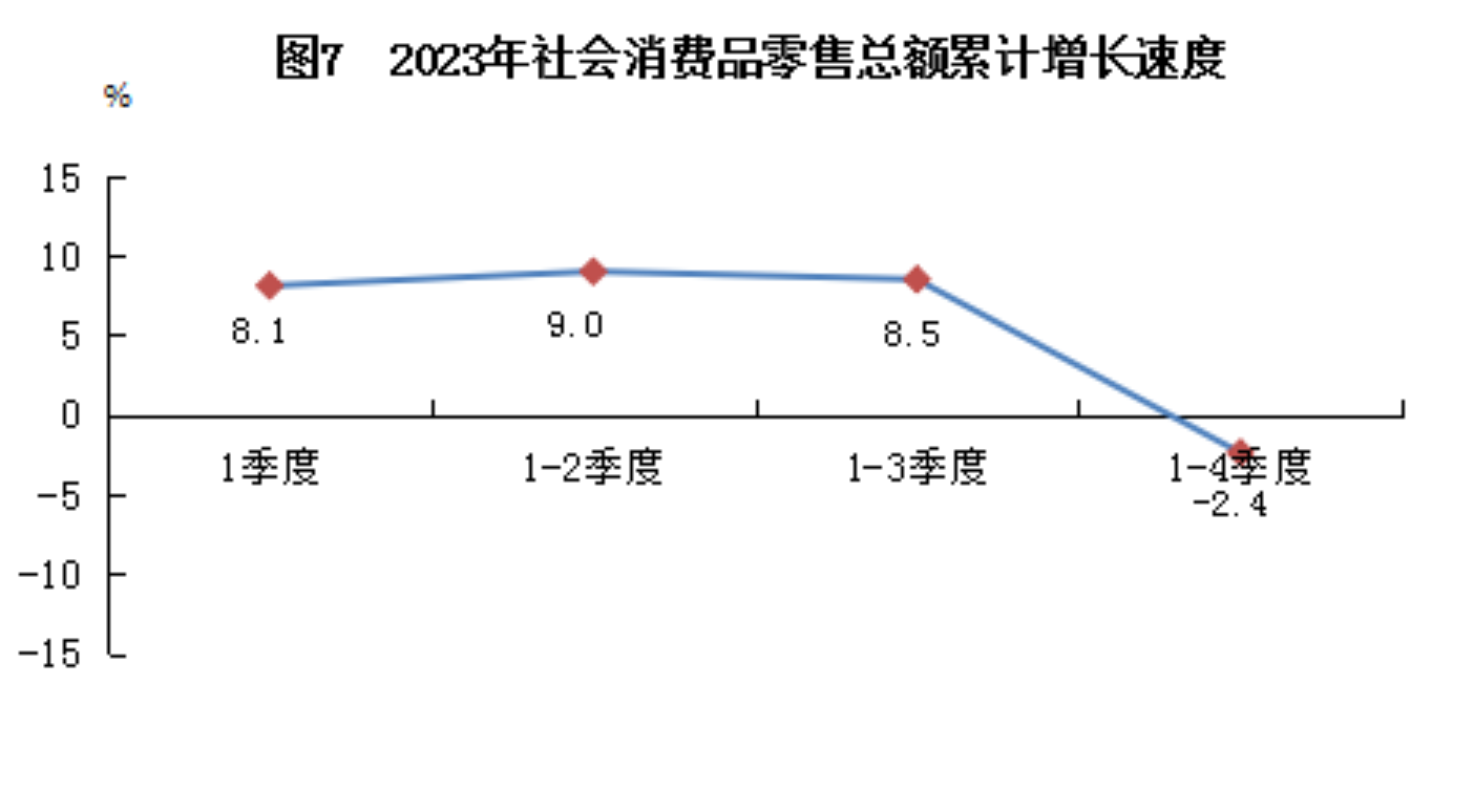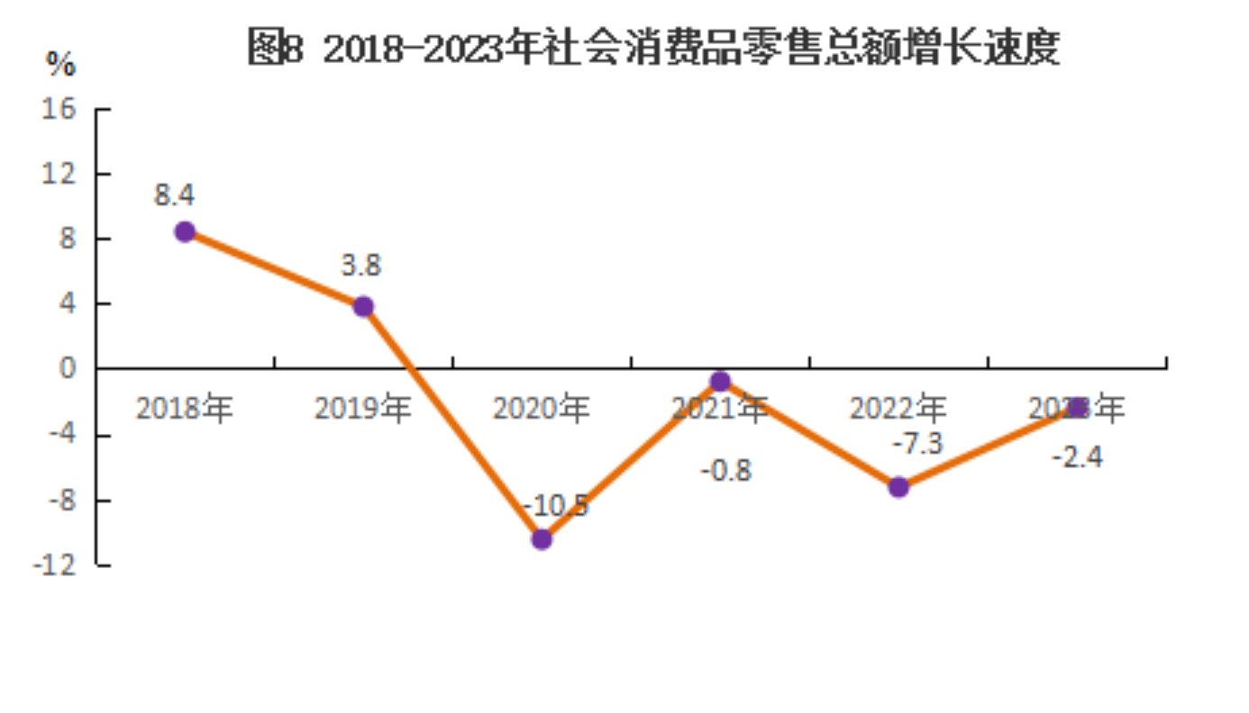 全年实现社会消费品零售总额比上年下降2.4%。按经营地统计,城镇消费品零售额下降1.0%;乡村消费品零售额下降5.6%。