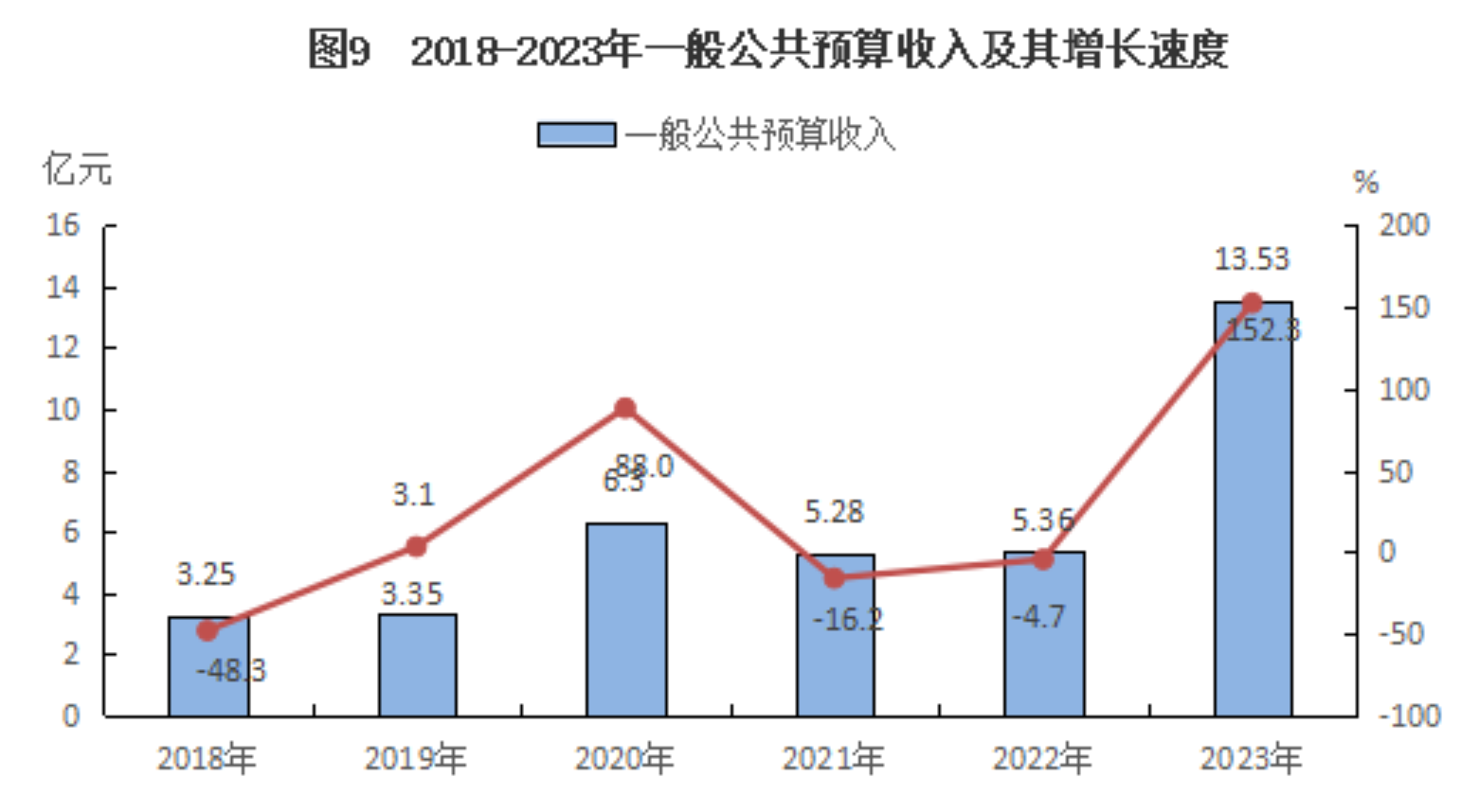 全年一般公共预算收入13.53亿元,比上年增长152.3%。其中,税收收入2.27亿元,增长10.9%;非税收入11.26亿元,增长239.6%。一般公共预算支出32.52亿元,增长41.5%。其中民生重点领域支出27.73亿元,增长51.5%。重点支出情况如下:教育支出5.31亿元,增长26.9%;科学技术支出0.38亿元,增长63.0%;文化旅游体育与传媒支出0.15亿元,增长15.4%;社会保障和就业支出4.80亿元,增长17.9%;卫生健康支出2.32亿元,增长13.9%;节能环保支出0.12亿元,增长41.5%;农林水支出5.51亿元,增长16.6%;交通运输支出6.68亿元,增长1757.6%;住房保障支出0.70亿元,增长61.0%。